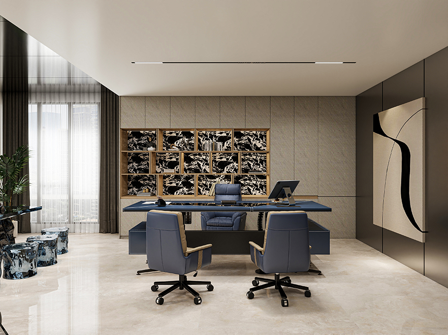 [Modern Office Aesthetics Space] The spacious general manager's office is dominated by dark brown wood grain and light gray marble, equipped with a Zen style conference table and customized cabinets, showcasing a team collaboration atmosphere. The independent office area is equipped with leather chairs and multifunctional solid wood customized cabinets, paired with artistic floral arrangements and floor lamps, enhancing decision-making efficiency through the interplay of light and shadow. The panoramic french window introduces natural light to create an efficient business aesthetic scene without losing temperature.