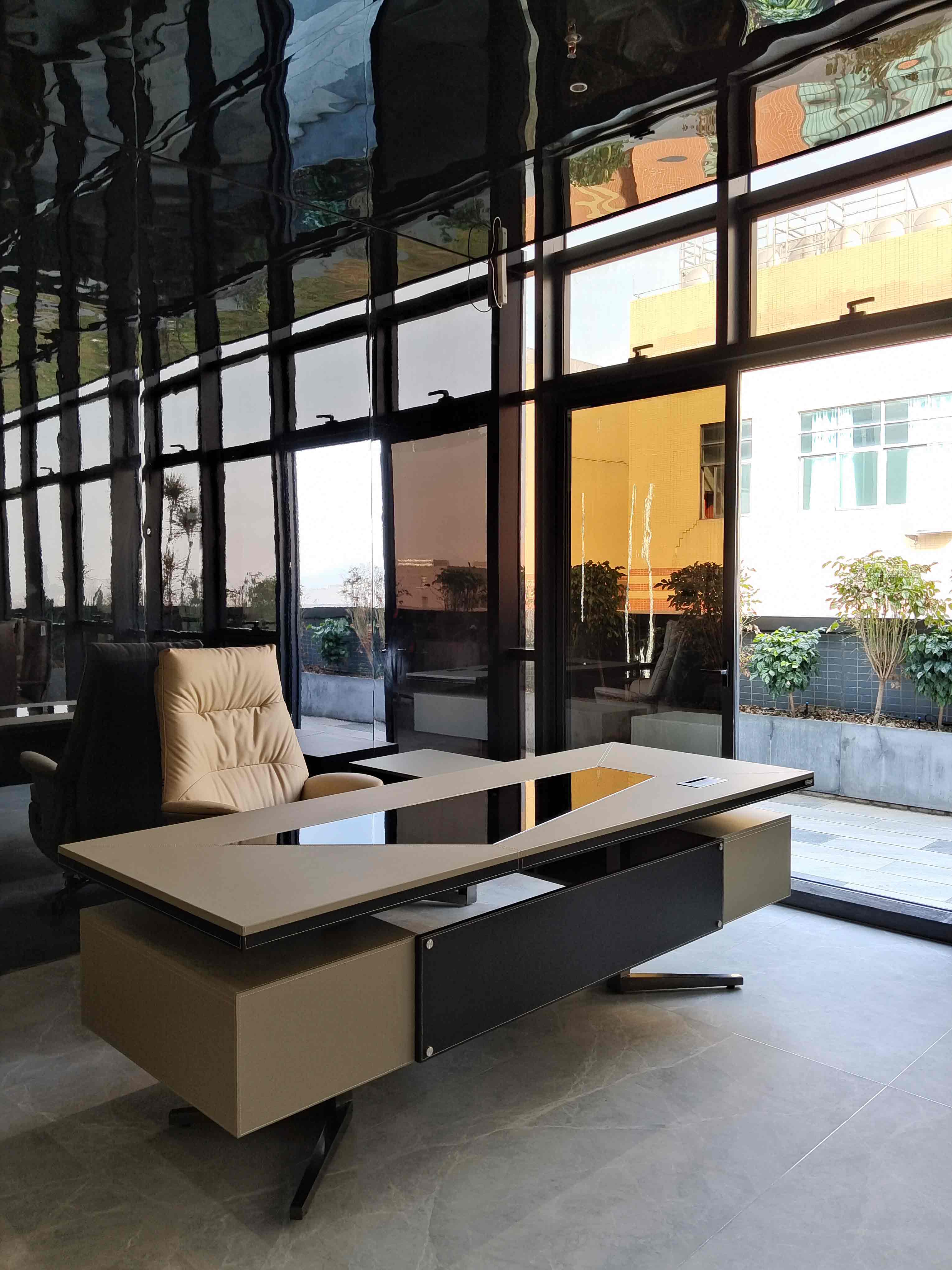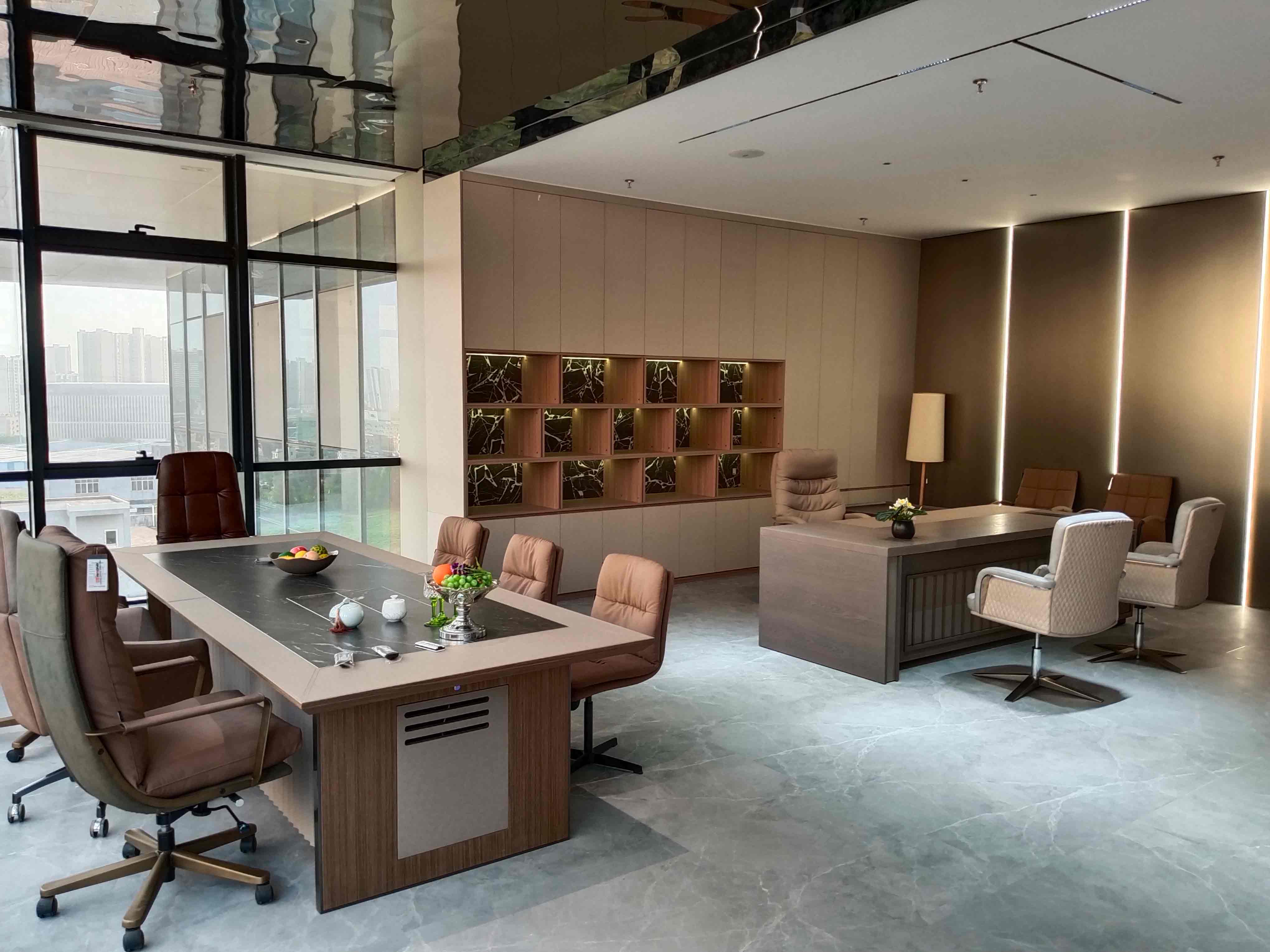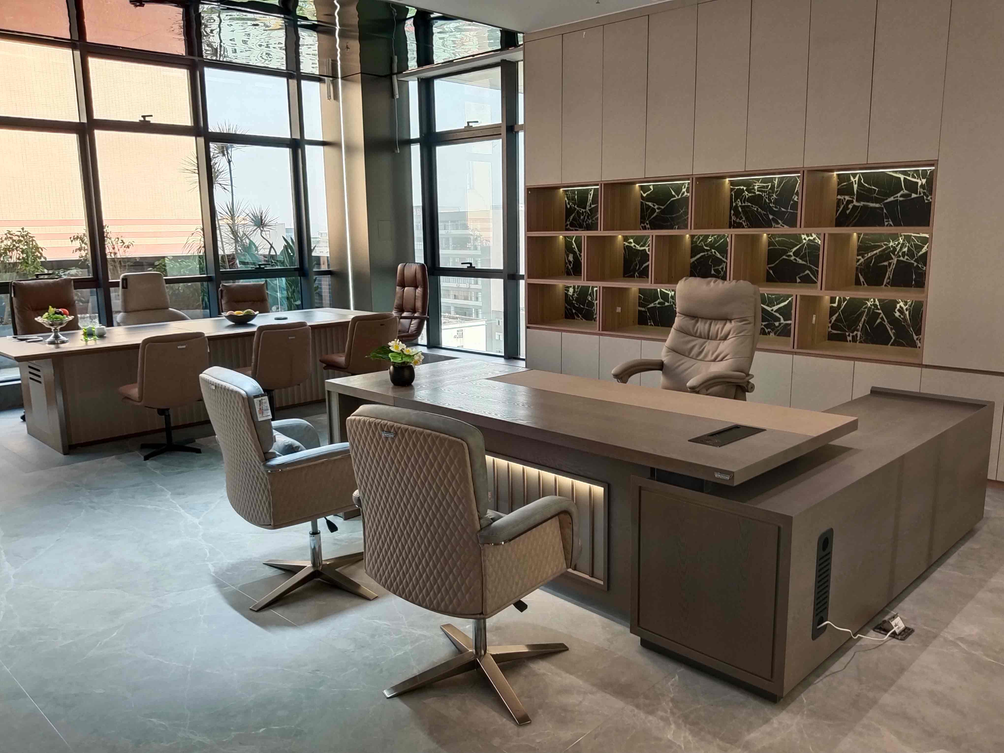 The deep brown solid wood giant office desk carries exquisite floral arrangements, and the beige patterned swivel chair and black gold long table form a visual symphony. The entire wall of black diamond marble cabinets exudes a luxurious texture under warm light, while the greenery outside the window is faintly visible, transforming the urban skyline into a natural screen - every inch of detail tells the story: this is the strategic command center of the decision-makers.