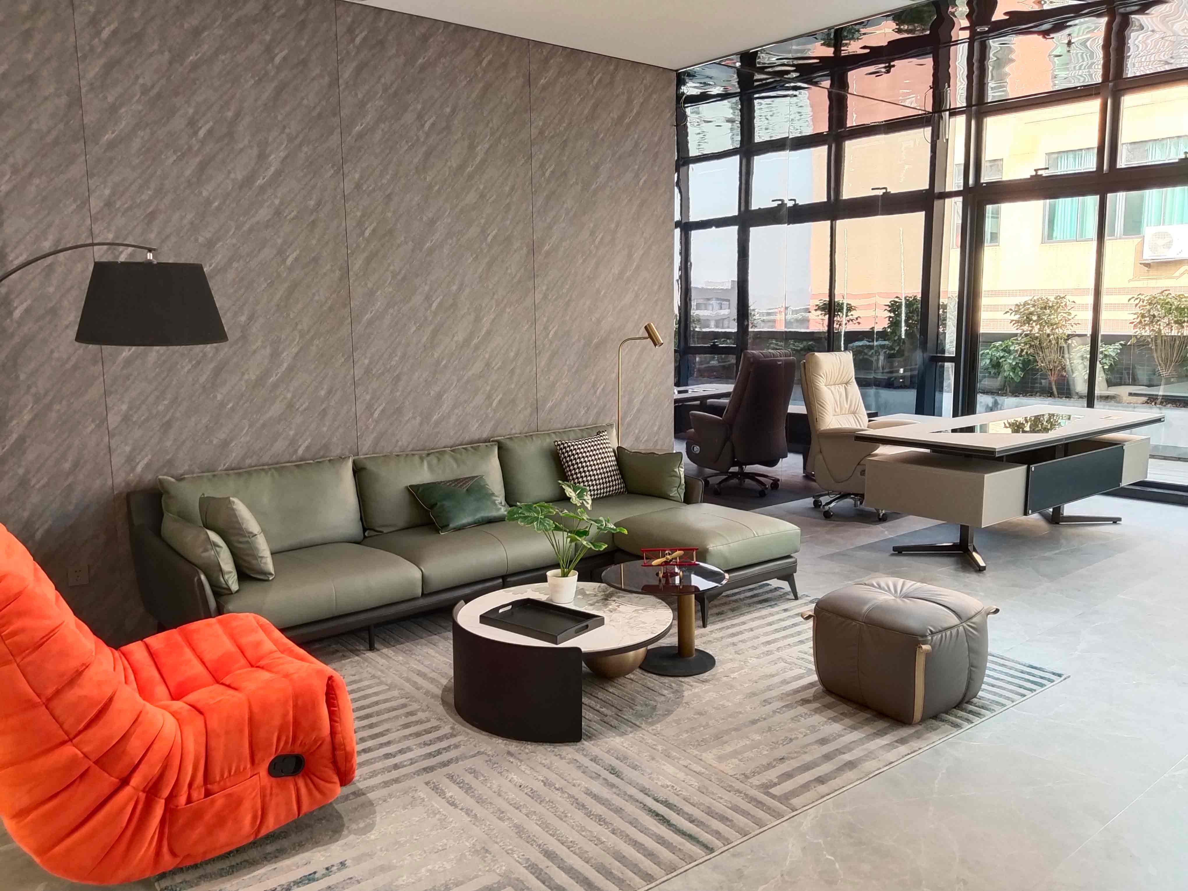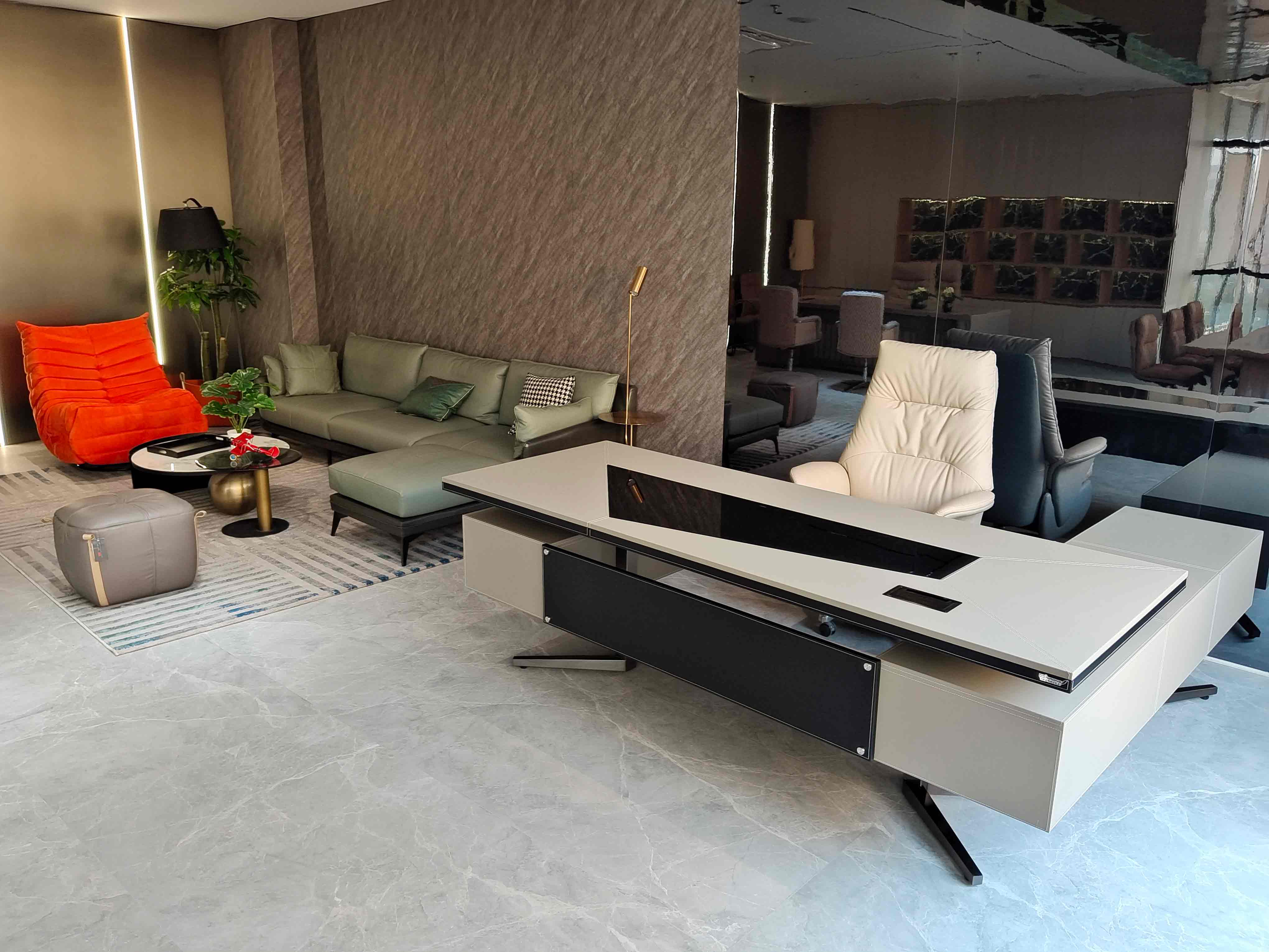 Black and white chessboard desks collide with orange artistic single chairs, while dark coffee L-shaped sofas and geometric coffee tables create a conflicting aesthetic. The golden floor lamp outlines the dark textured background wall, while the pillows and green plants quietly inject natural vitality - this place has both an elite aura and a lazy corner, making business negotiations instantly inspired and collide with the scene!