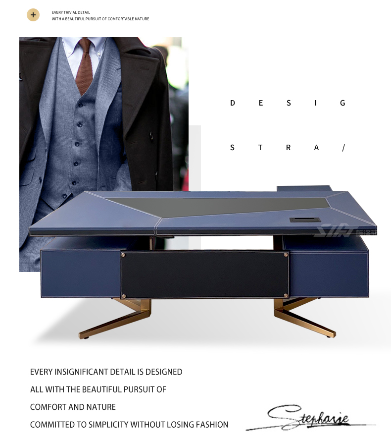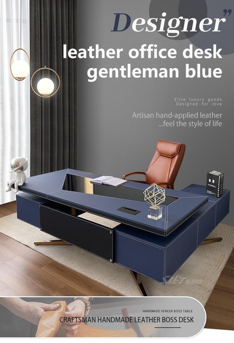 Hermes blue office deskTable Set Custom design Minimalist luxury and tasteful high-end atmosphere hermes-blue-office-deskHermes-blue-office desk For this blue luxury executive office desk, the table top is marble veneer,with soft leather.gold steel metal frame and black grid leather .With a strong flavor of frontier, it show us sedate and unbreakable innovative by its combination of black stalinite and exquisite line pressing process. hermes-blue-office-desk This fantastic combination has become a group of fashion and traditon to effect our vision with unbeliveable infection. There're so many color for the luxury executive desk set,we can according to your space to design and custom the color,size you need.Hermes blue office desk. We have our own workshop, manual custom assembly, can be tailored to your size, to provide you with luxury interior custom furniture design services