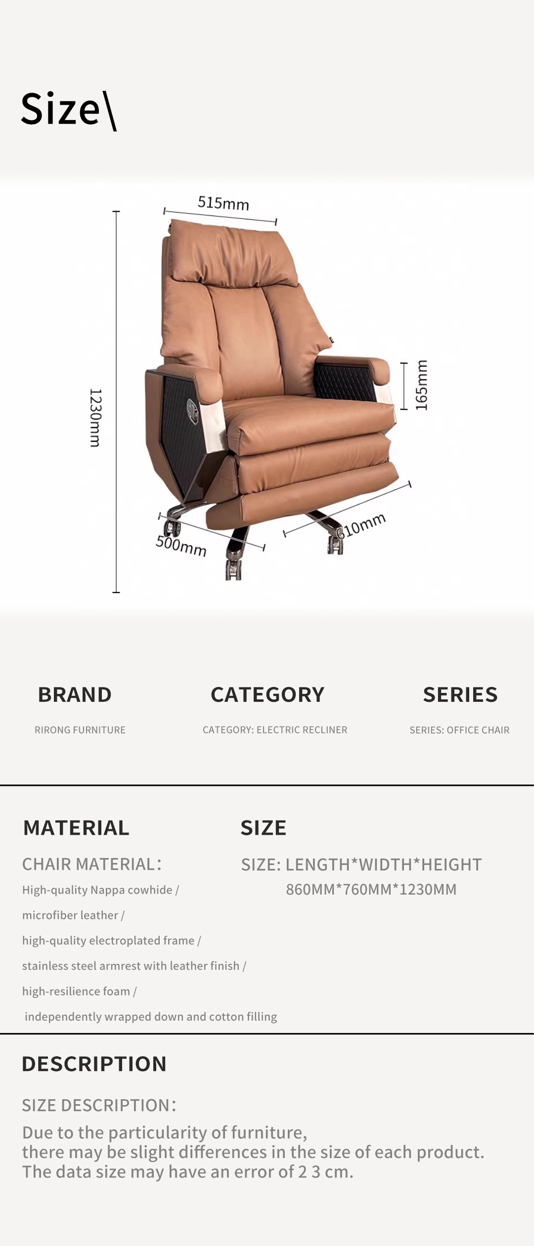 The intelligent electric recliner specially designed for elites now supports multi-color high-end customization! Deep blue is calm and atmospheric, while beige brown is elegant and understated. There are also multiple color options available, perfectly matching the luxurious atmosphere of the CEO's office and easily blending into the warm style of a home study. High grade leather material combined with ergonomic design, headrest, lumbar support, and electric adjustment are all one click in place, making every moment of rest a pleasure.