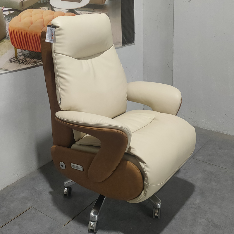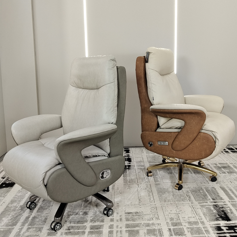 The chair body is made of high-density rebound filling material, paired with leather fabric,. The bottom is equipped with silent universal wheels and a stable five-star metal tripod, which is flexible in movement and has strong load-bearing capacity. Whether paired with a minimalist office desk or serving as the finishing touch for a reading corner in a study, its modular color blocking design and ergonomic armrest structure can become the visual focus of the space, balancing practicality and artistic sense, redefining the comfort standards of smart home and office scenes.