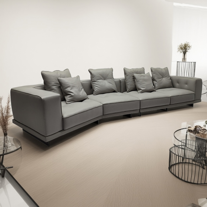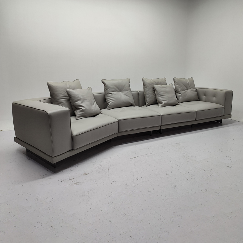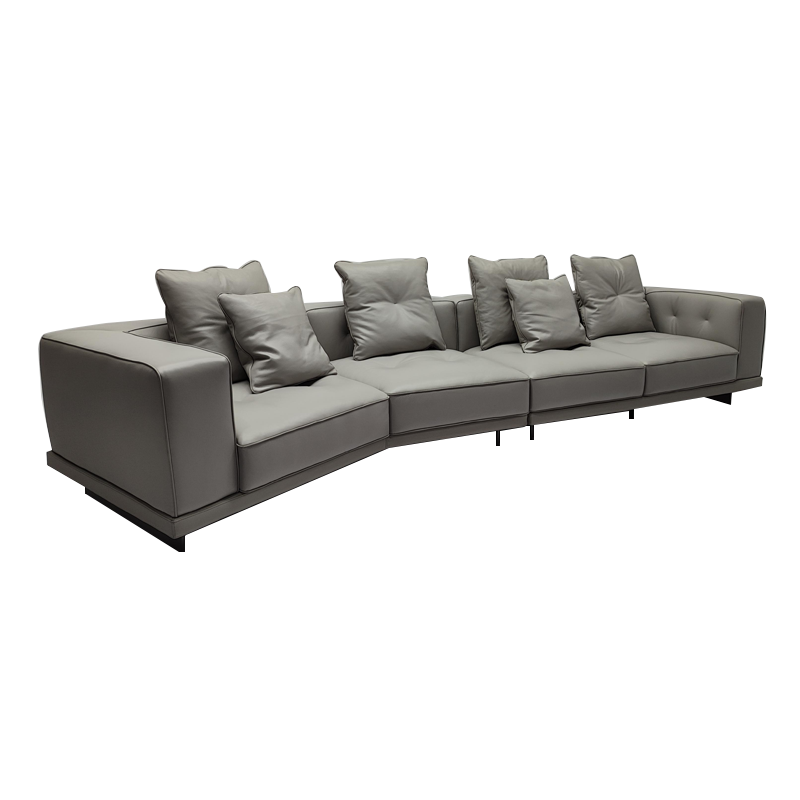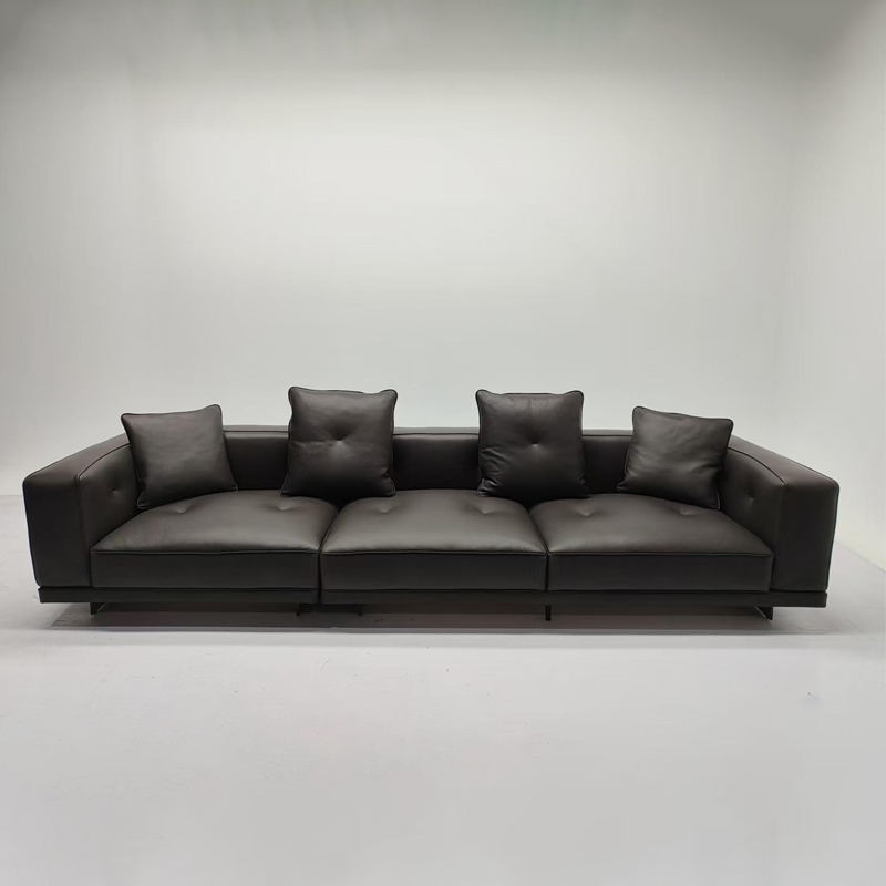 This Dylan sofa is a living room furniture that combines modern aesthetics with practical functionality. Its design adopts a minimalist style, with smooth lines and a high backrest structure, which not only presents a simple and fashionable visual effect, but also provides excellent back support for users. The main body of the sofa is made of high-quality leather fabric, with a deep gray tone that is stable and atmospheric. Paired with the same color stitching details, it highlights a low-key and luxurious texture.