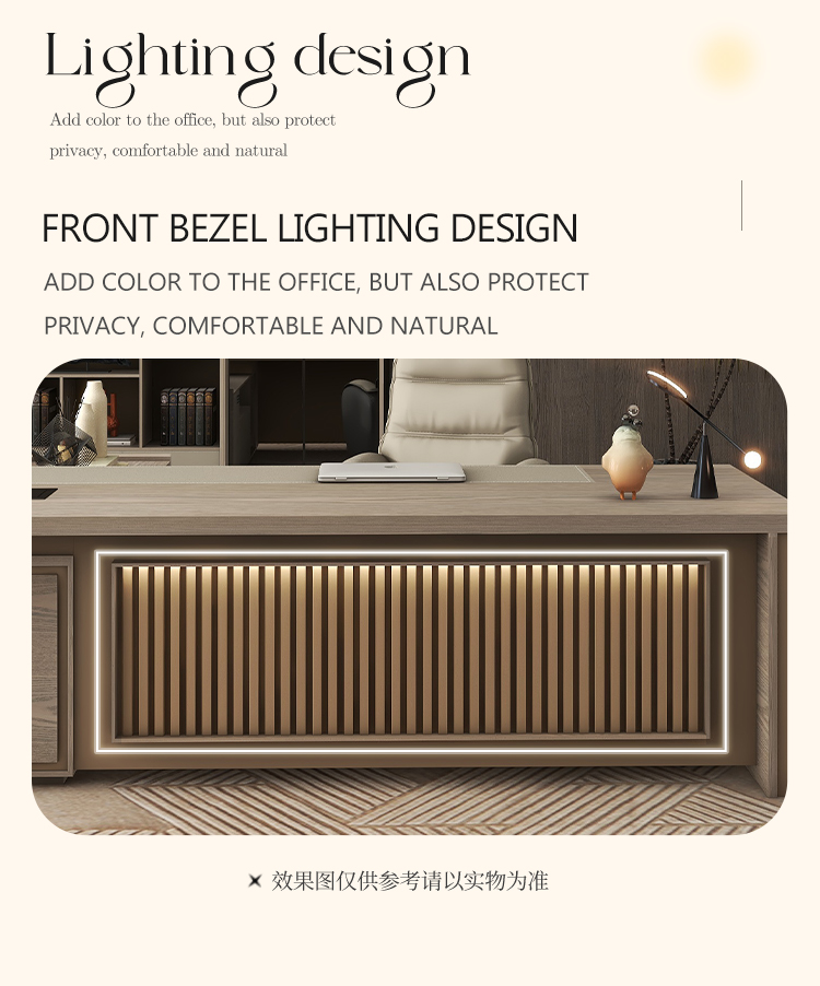 Side cabinet with smart combination lock, wrapped in leather trim fabric. Multifunctional junction box, front baffle lighting design, add color to the office, can also protect privacy, comfortable and natural.