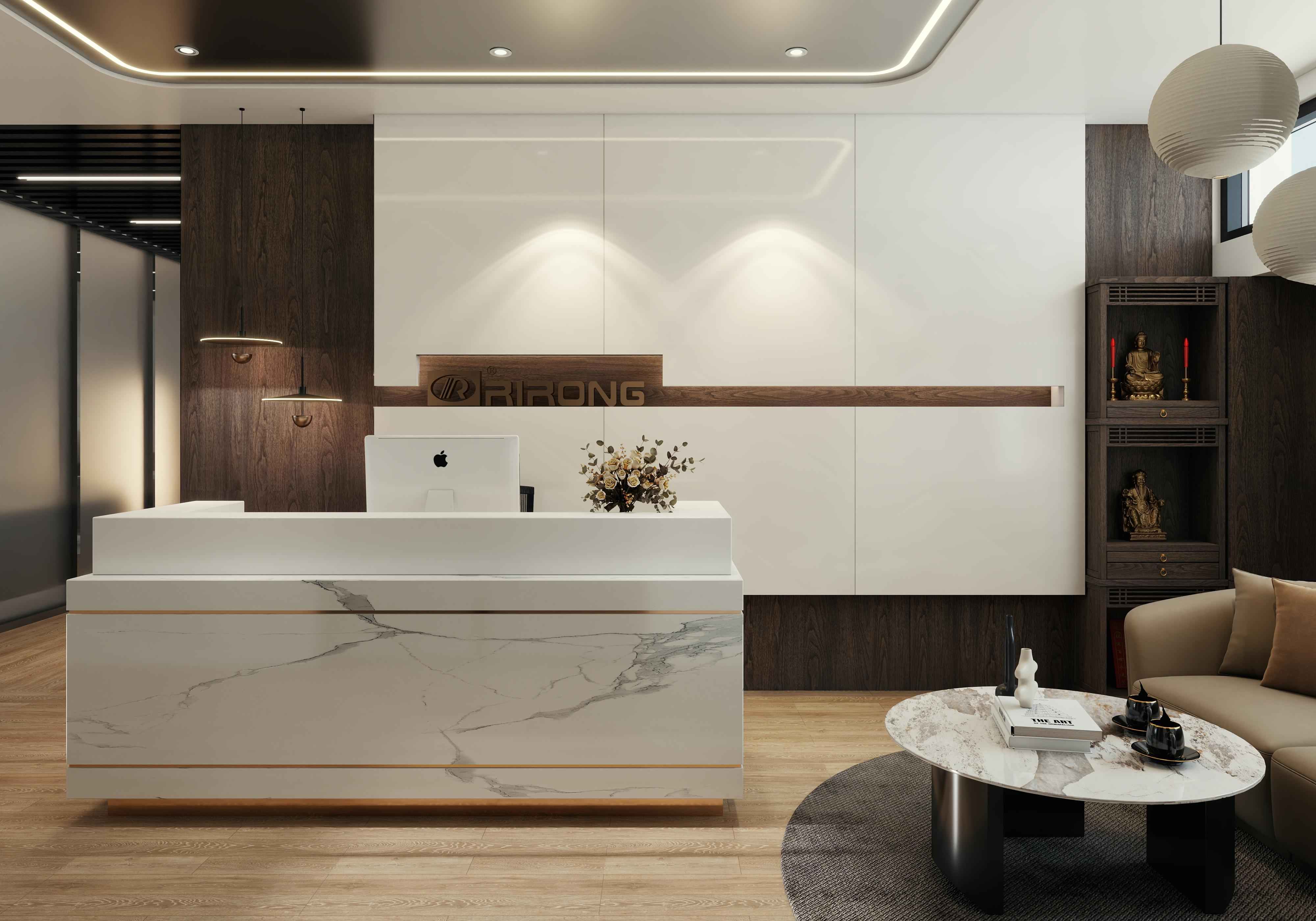 Rirong excels in crafting bespoke office furniture, offering a holistic solution to your India office design needs, with grey and orange as the dominant hues.