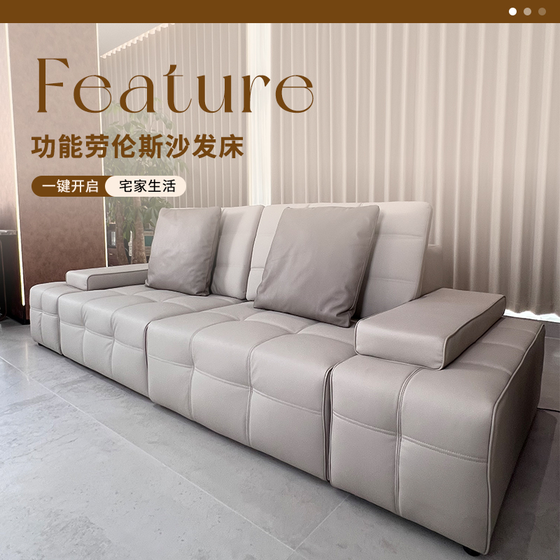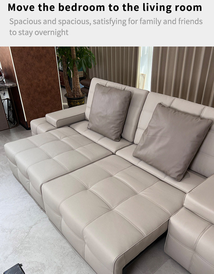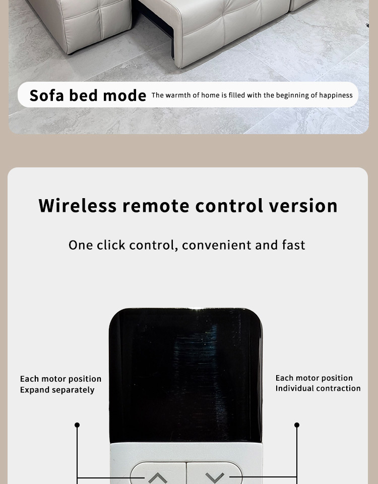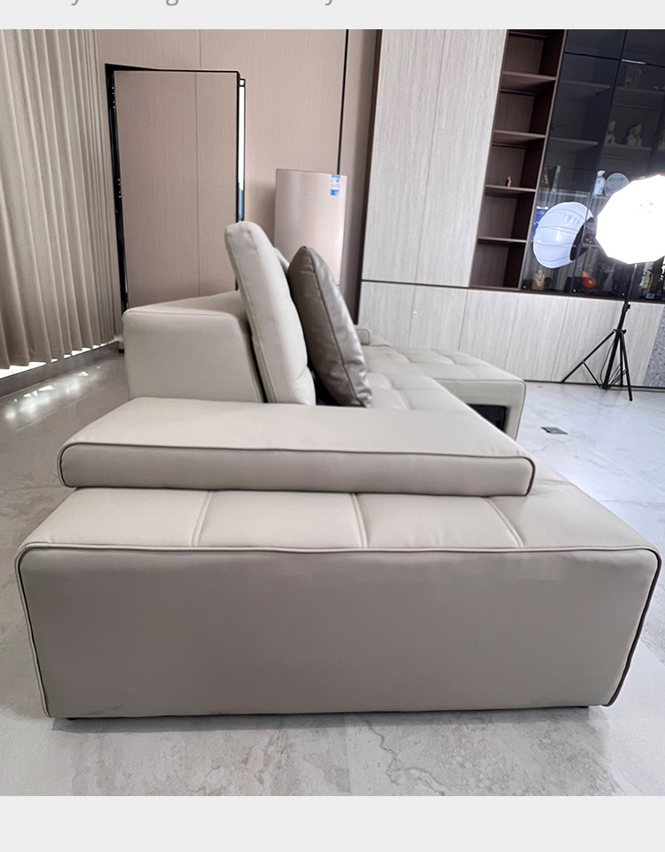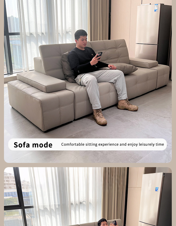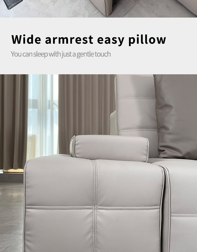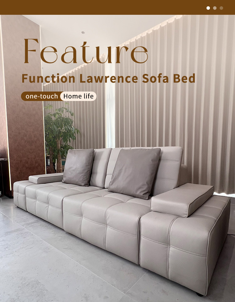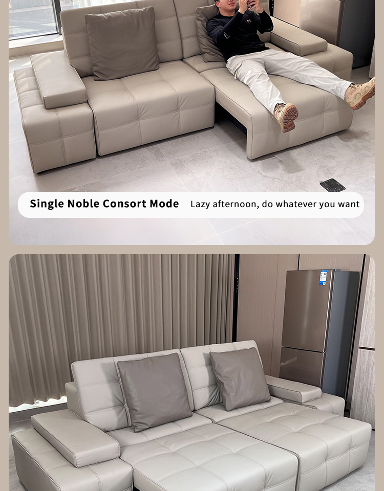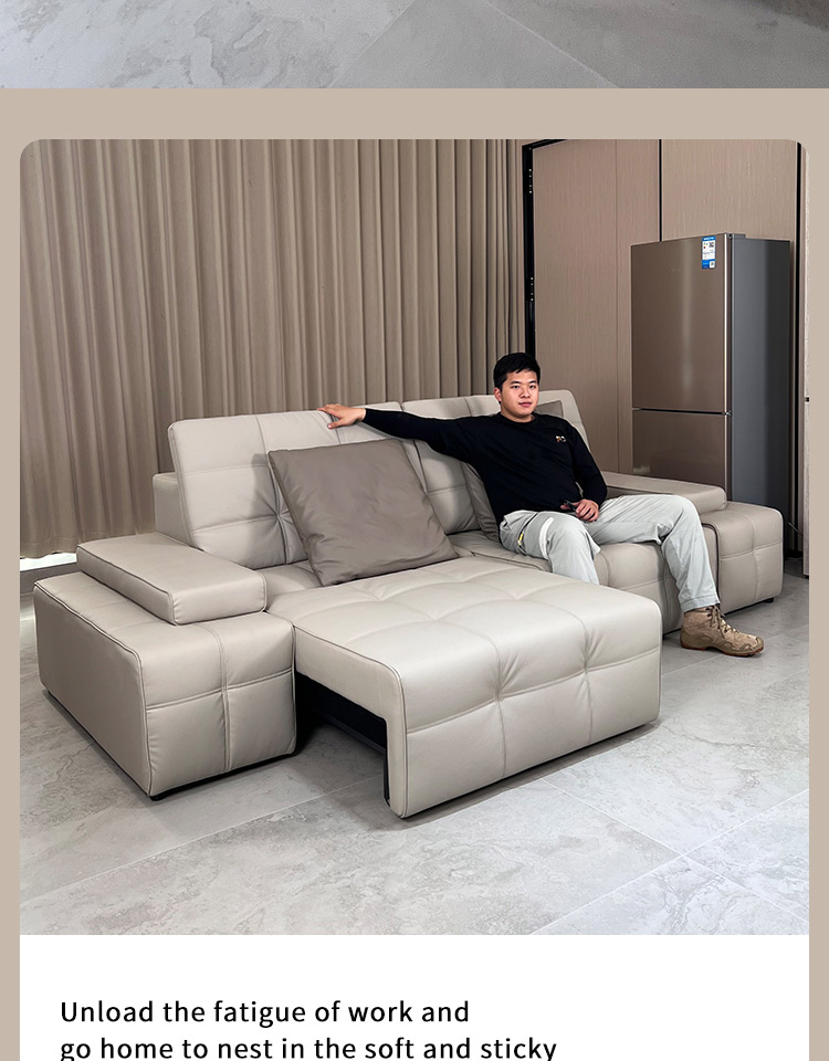 The Lawrence electric function sofa has a simple and elegant appearance, with a light beige color that exudes elegance. Modular design allows for flexible combination according to space. Equipped with electric adjustment function, it can easily adjust the sitting posture and also turn into a sofa bed to meet your different leisure needs. The backrest and cushion are soft and comfortable, paired with textured pillows, creating a cozy and relaxing corner of your home.
