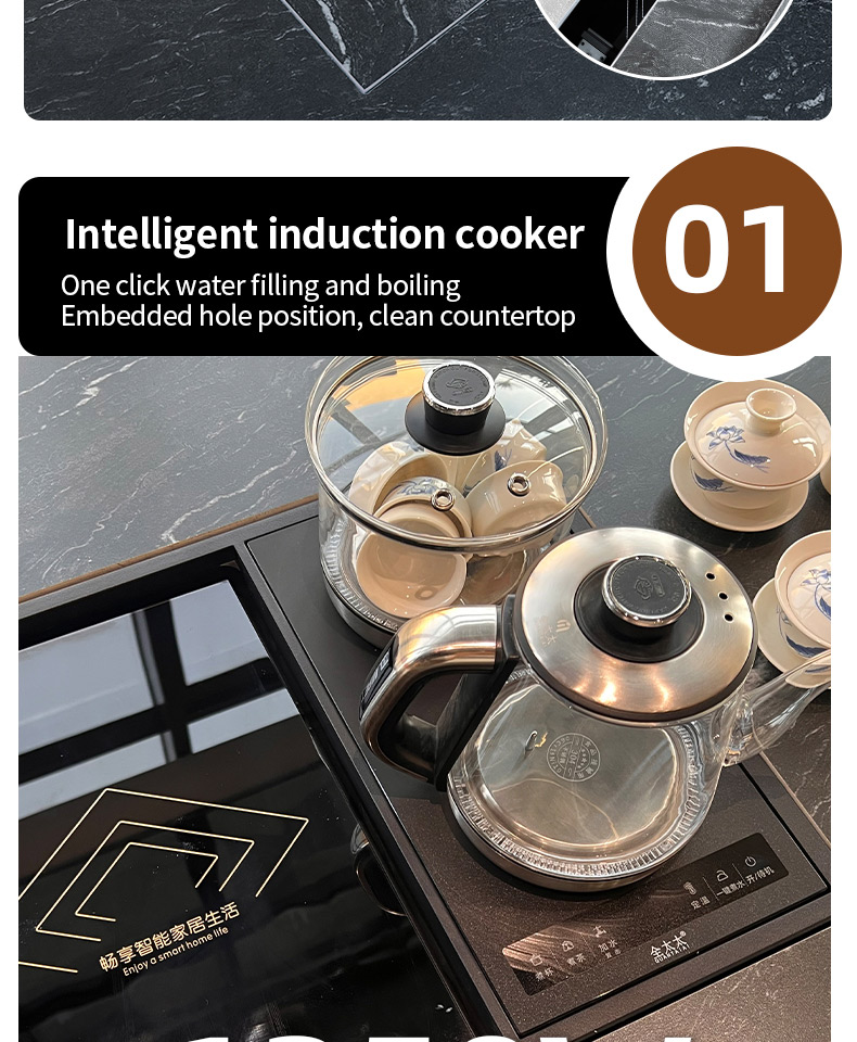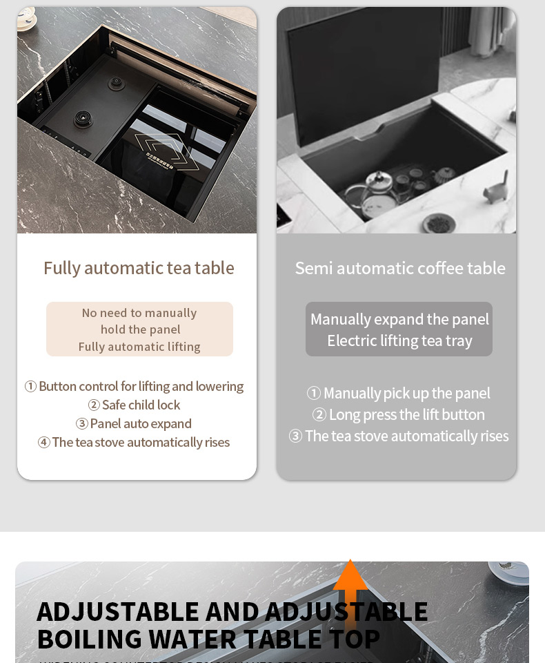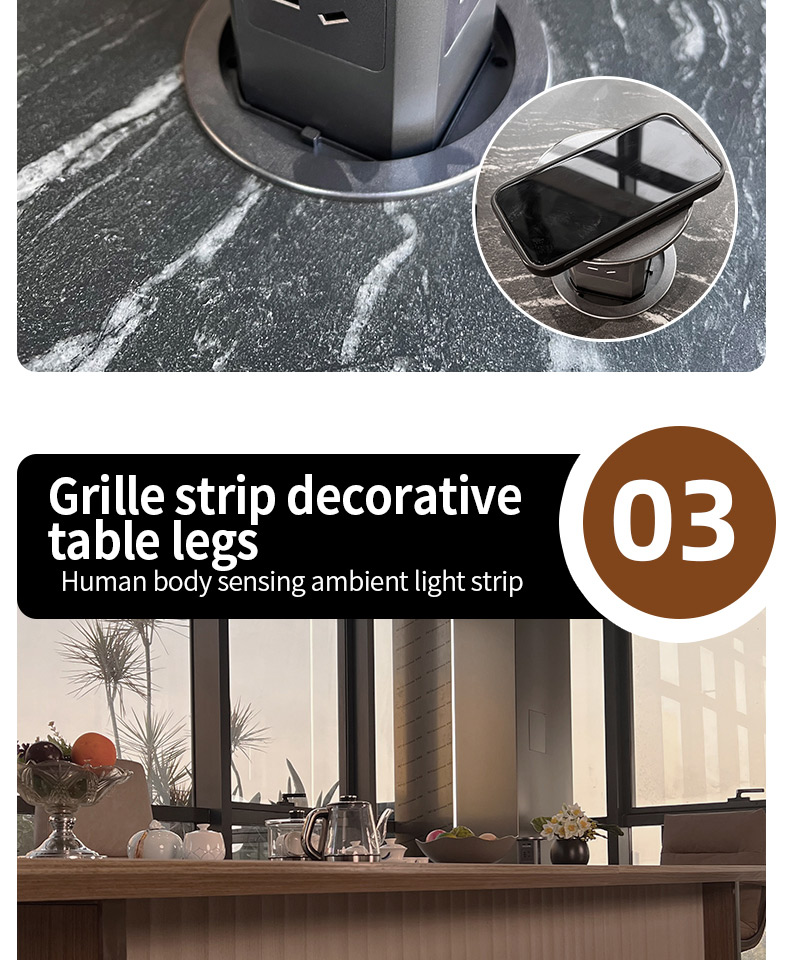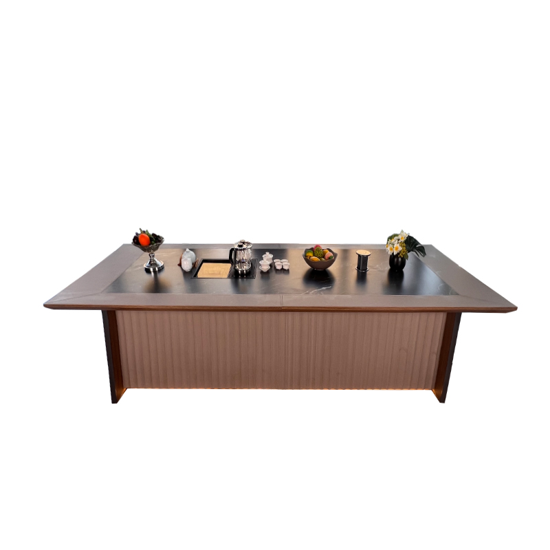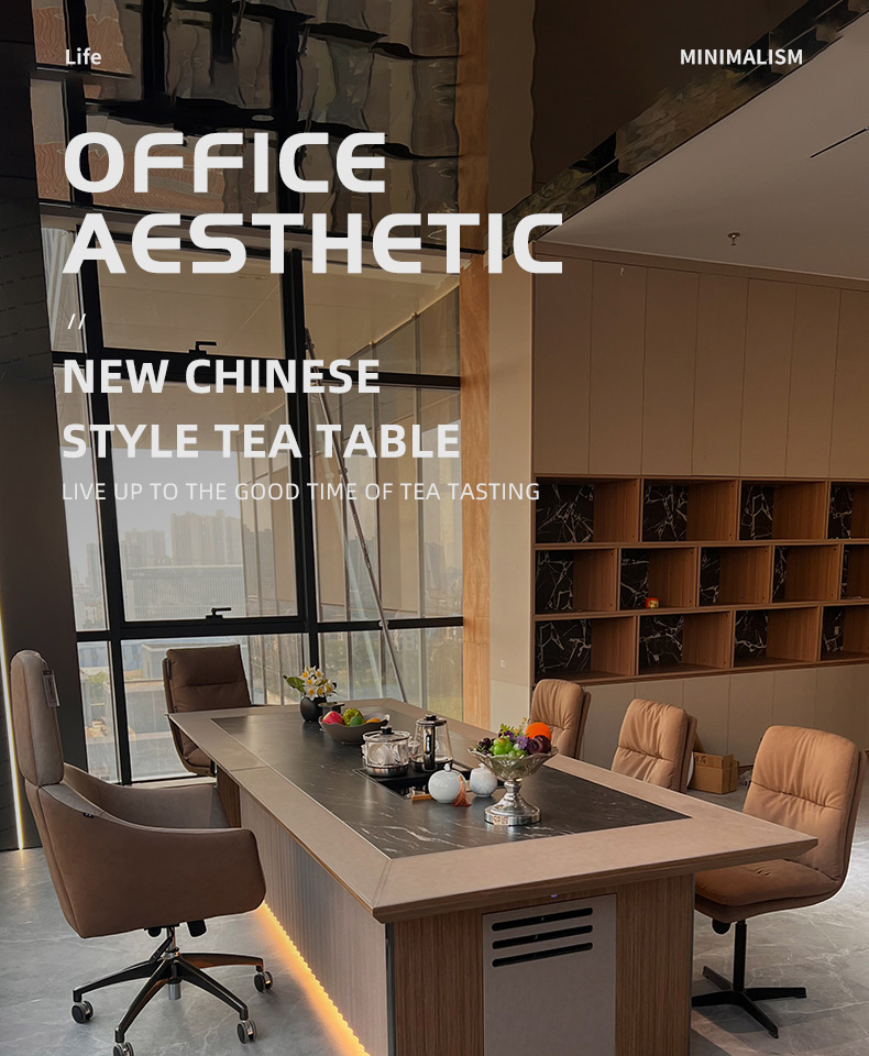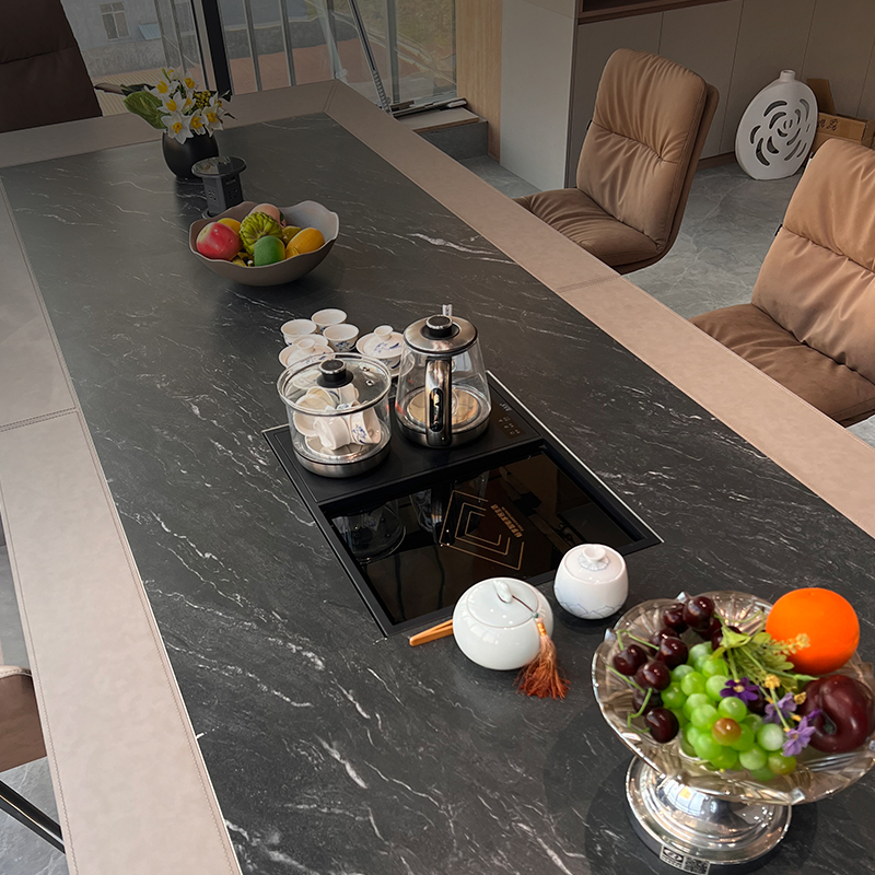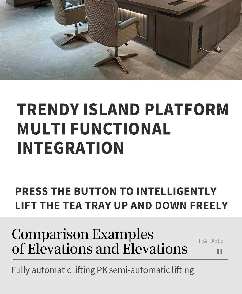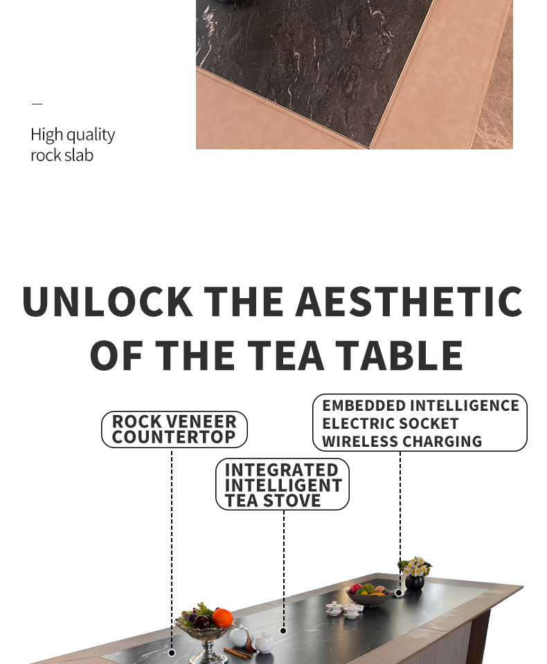 Modern light luxury tea table, specially designed for tasters! The black rock tabletop is wear-resistant and stain resistant, combined with natural wood veneer and stainless steel frame, combining rigidity and flexibility, and exuding a sense of luxury. The tea table is equipped with an intelligent hidden lifting tea tray, a circular lifting socket, and a warm atmosphere light embedded at the bottom. When lit at night, it instantly enhances the spatial style. The grille line base is stable and atmospheric, and every detail showcases ingenuity. Whether it's business negotiations or home tea tasting, it can be the focus!