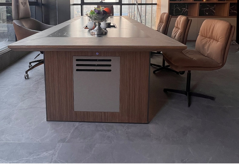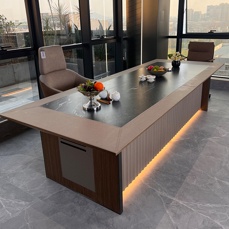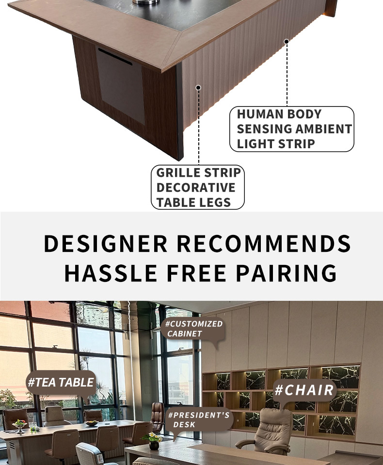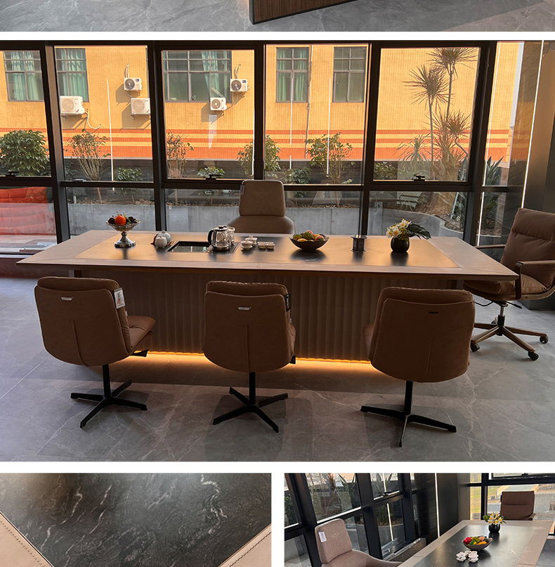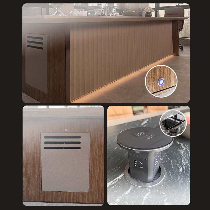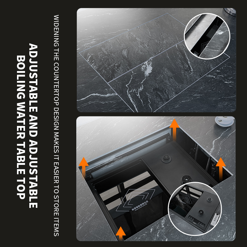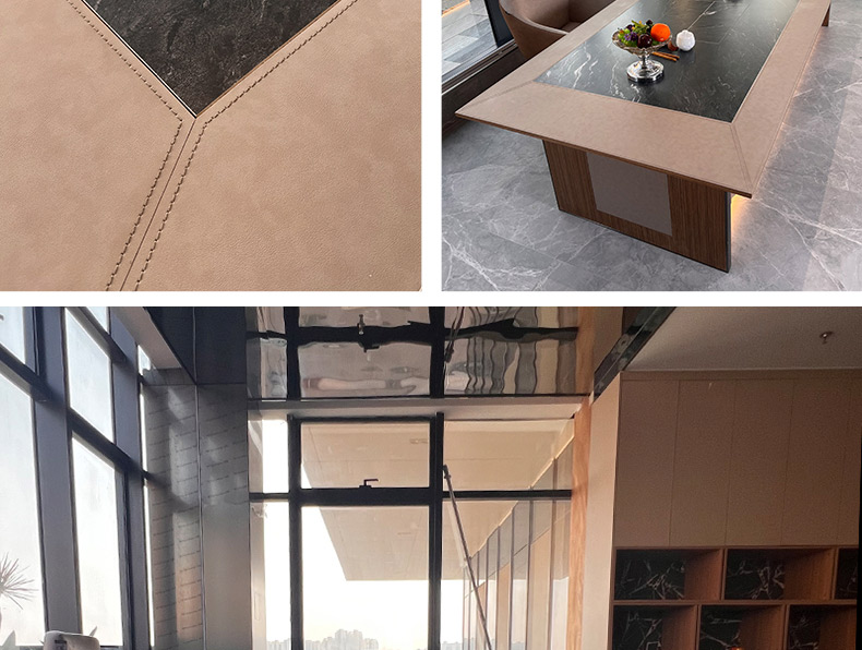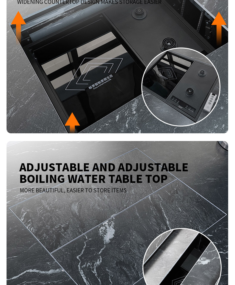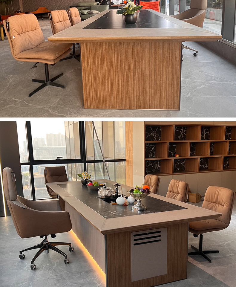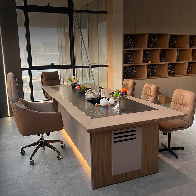 Modern light luxury tea table, specially designed for tasters! The black rock tabletop is wear-resistant and stain resistant, combined with natural wood veneer and stainless steel frame, combining rigidity and flexibility, and exuding a sense of luxury. The tea table is equipped with an intelligent hidden lifting tea tray, a circular lifting socket, and a warm atmosphere light embedded at the bottom. When lit at night, it instantly enhances the spatial style. The grille line base is stable and atmospheric, and every detail showcases ingenuity. Whether it's business negotiations or home tea tasting, it can be the focus!