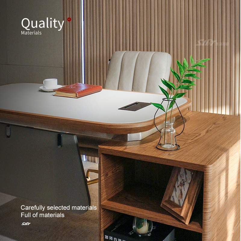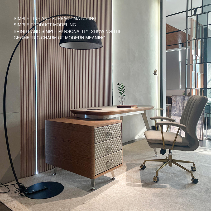 Log color wood grain, craftsman hand-applied leather, brushed stainless steel feet Choose our Four reasons Fashionable luxury study desk High-end automotive leather Log wood grain Thicken the desktop Brushed stainless steel frame Unique ingenuity RR MUYU HOME DESK