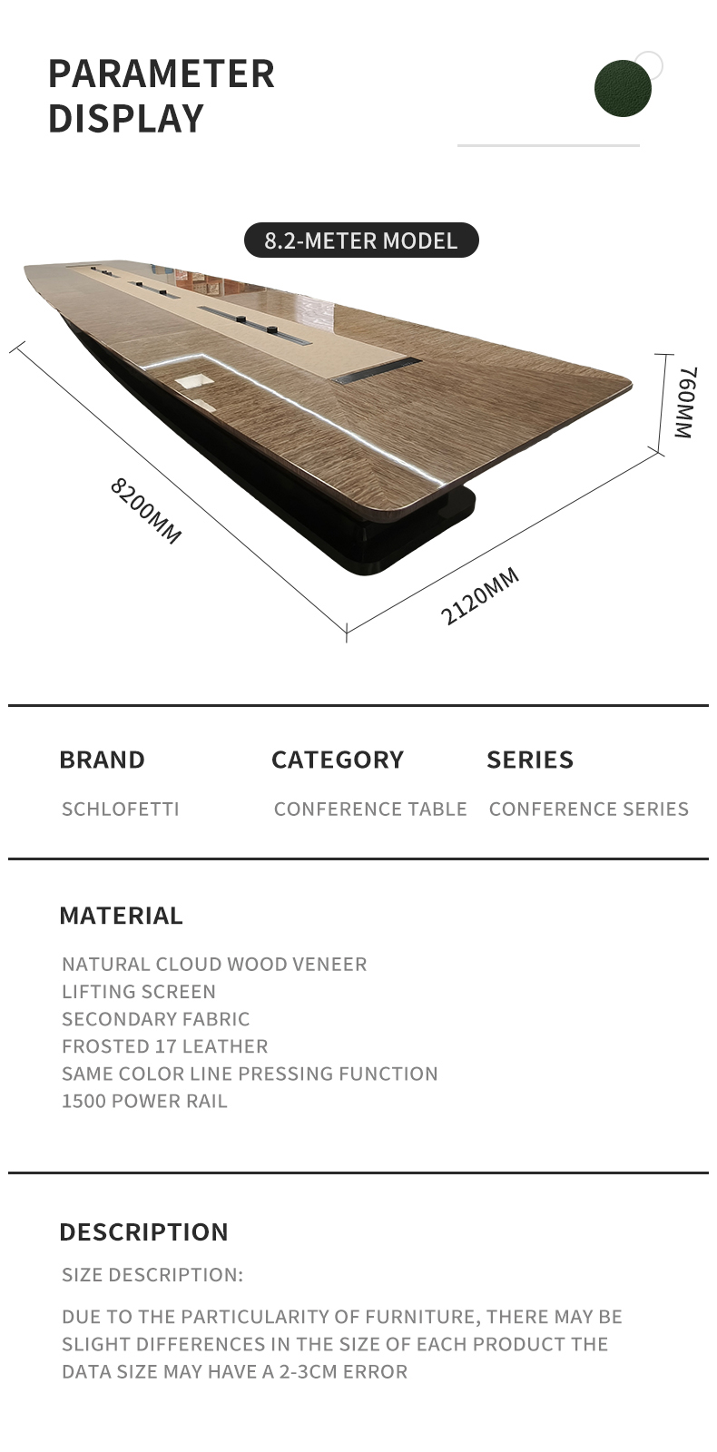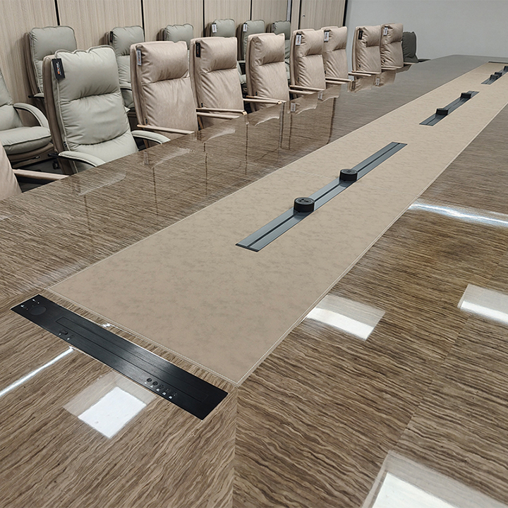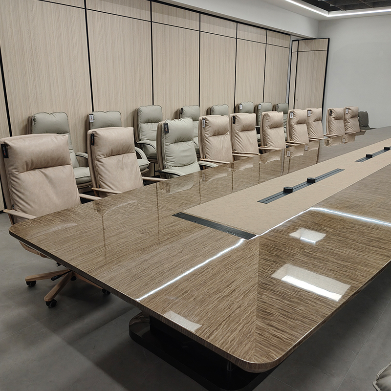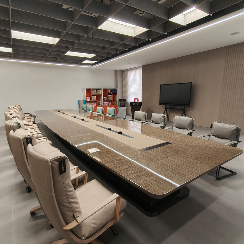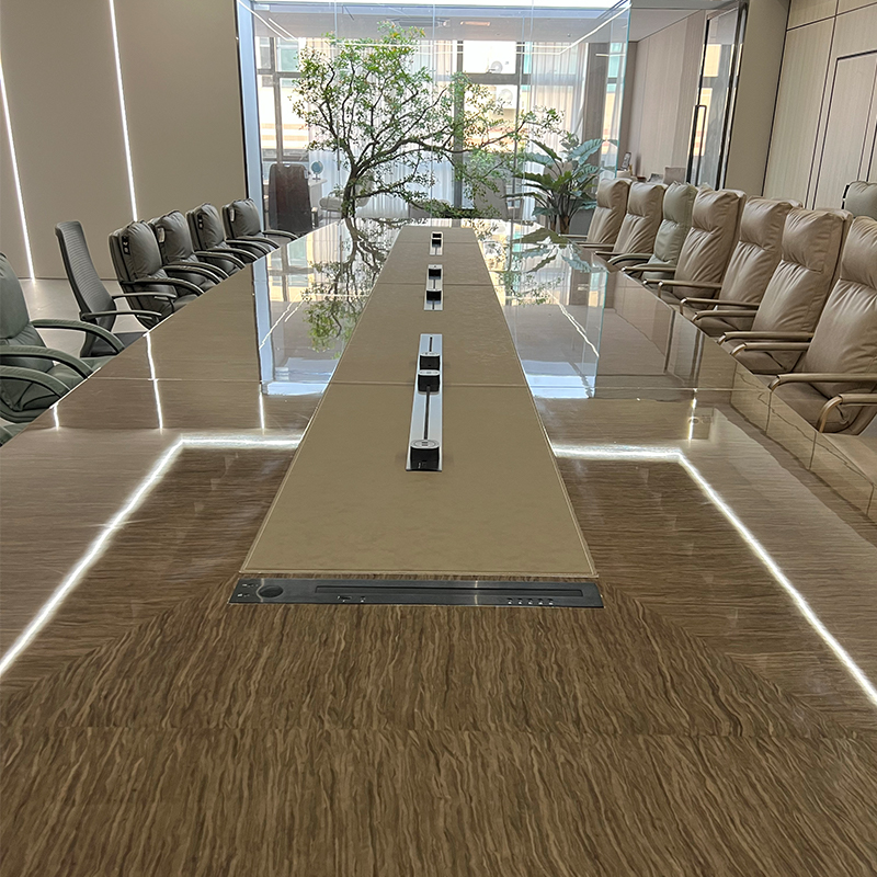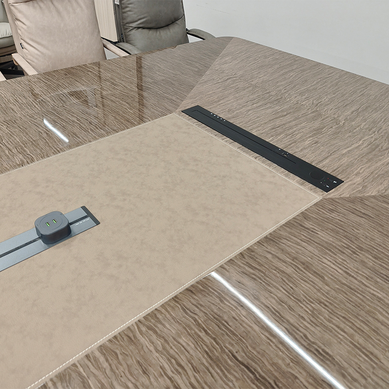 Introduce the Qihang Conference Table, which is a large curved rectangular table that combines exquisite style and cutting-edge technology. This extraordinary work is the result of the painstaking efforts of our Jirong team, based on stunning piano lacquer surfaces. This intelligent model showcases the perfect fusion of natural cloud wood, leather, and hardware inlay.